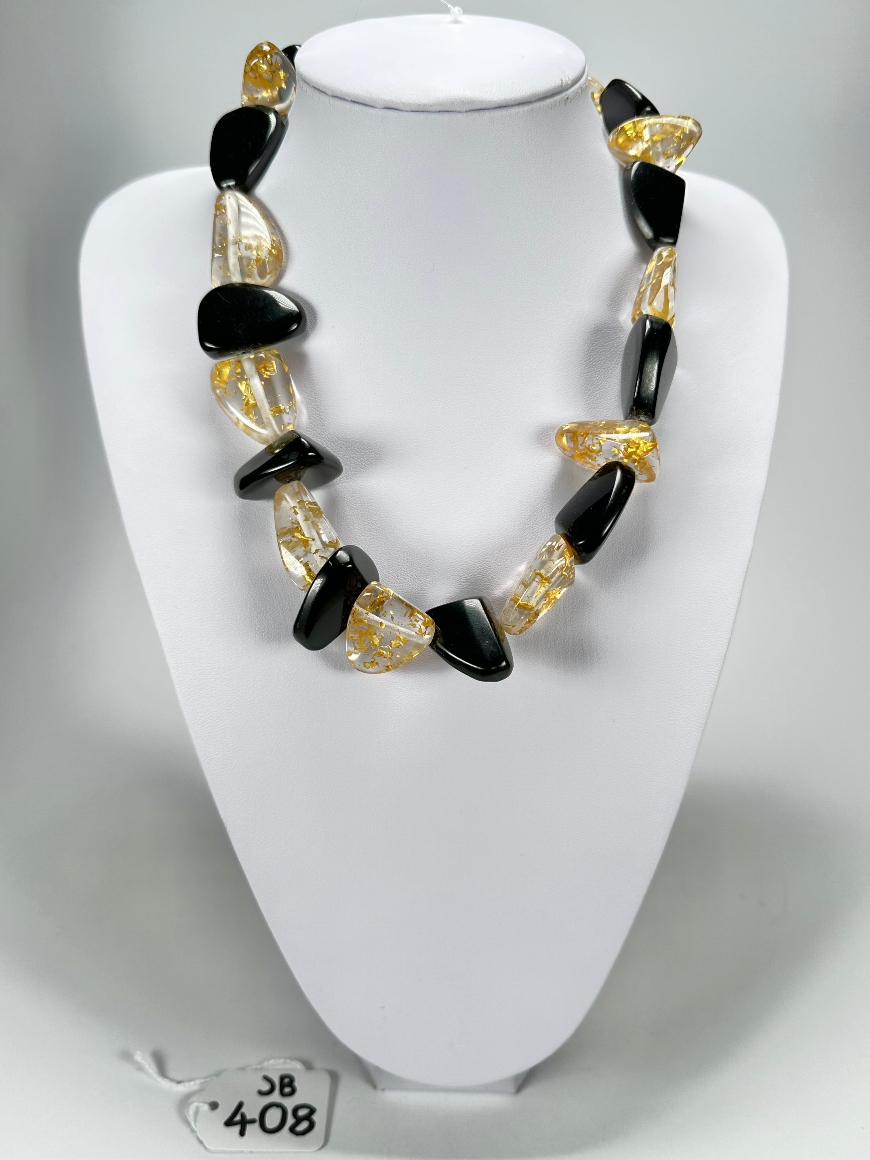 Jackie Brazil "Diamonds" Black Gloss & Gold Flakes Flintstone Bone 55cm Necklace ( N0061 )