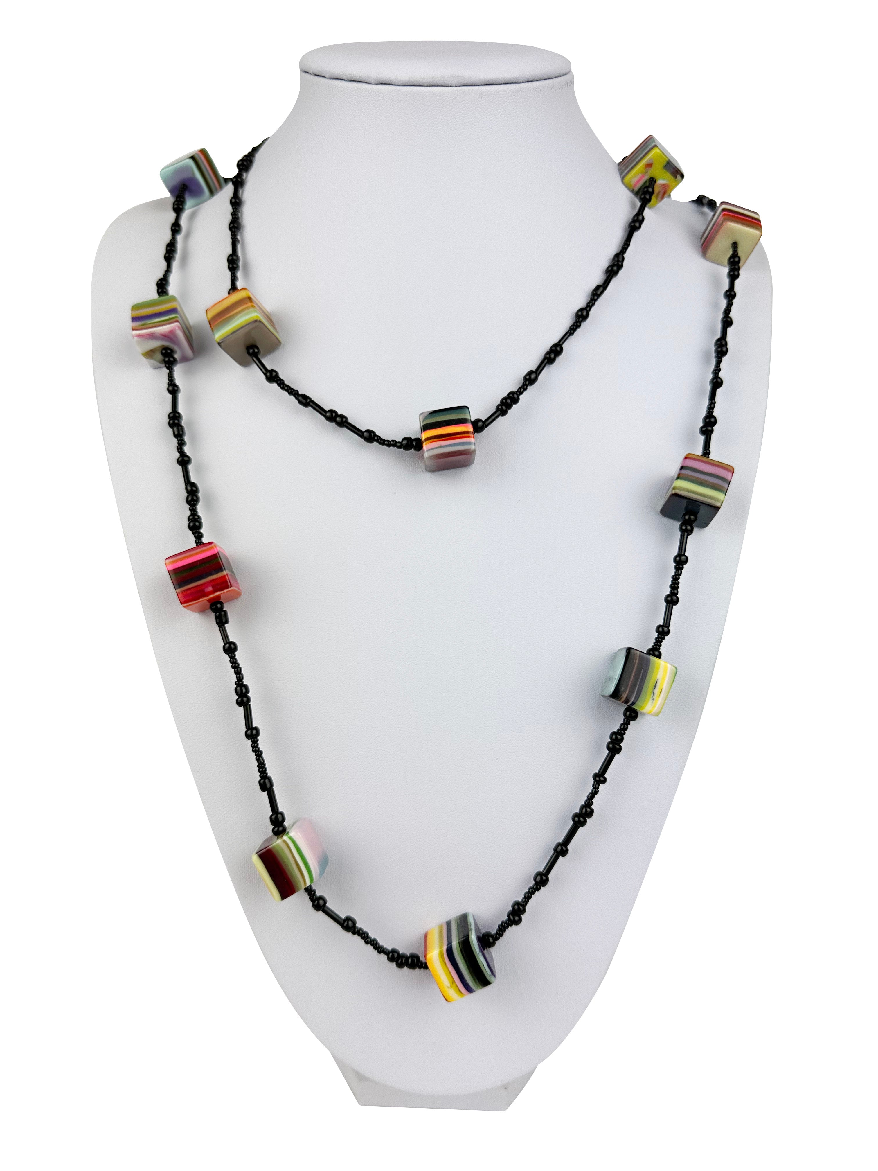 Jackie Brazil "POP" Liquorice Allsorts Art Small Cubes with Long Black Beads 110cm Necklace ( N0332-B )